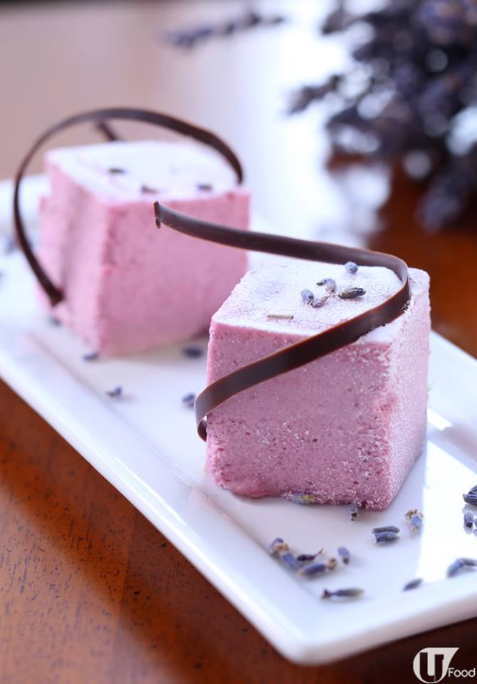 大廚將薰衣草煮成糖水,加進慕絲中,香氣突出之餘,質感輕巧;沒想過薰衣草的香氣,與法國黑莓果蓉酸酸的味道如此搭調,酸酸甜甜。