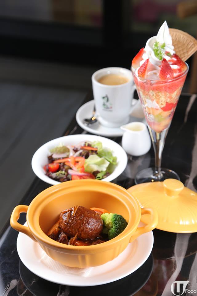 有齊沙律、日式炆煮物配白飯、迷你芭菲及飲品,其中亮點芭菲有香蕉朱古力、士多啤梨軟雪糕和栗子蓉共 3 款味道選擇。