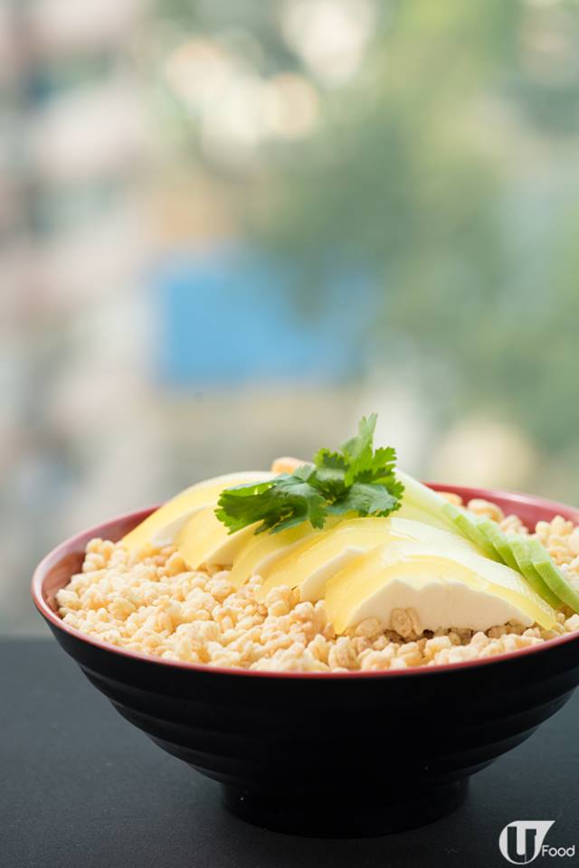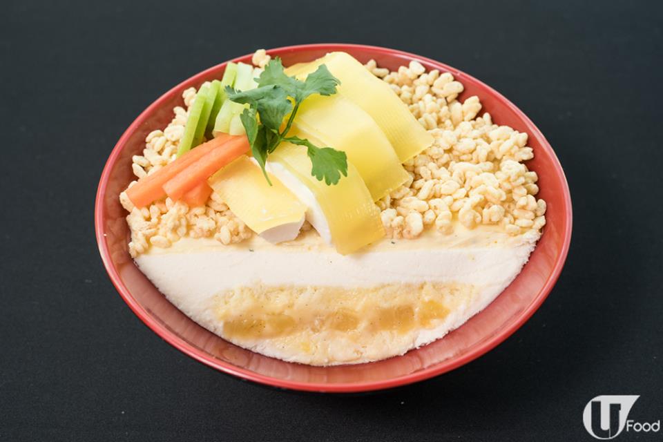 「海南雞」係菠蘿果蓉啫喱 + 椰子慕絲,「飯底」則係呍呢嗱味海綿蛋糕,配上鮮菠蘿果蓉啫喱、椰子慕絲及金不換吉士慕絲,飯粒則是卜卜米。