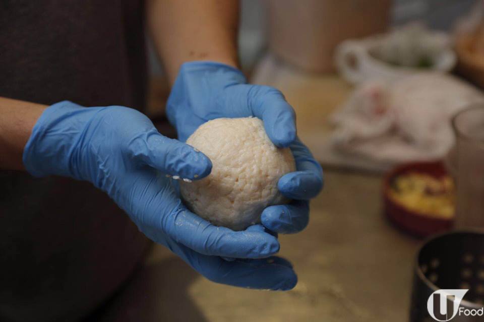 甜品師先將新鮮芒果打成蓉再製成啫喱狀,方便釀入飯波中間做餡,然後再將飯搓成球狀。