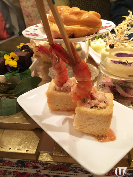 由鹹點食起,的骰正方形嘅 蝦多士釀入蝦肉配千島醬,再用竹籤串起原隻蝦,插喺多士上,造型好搶眼!