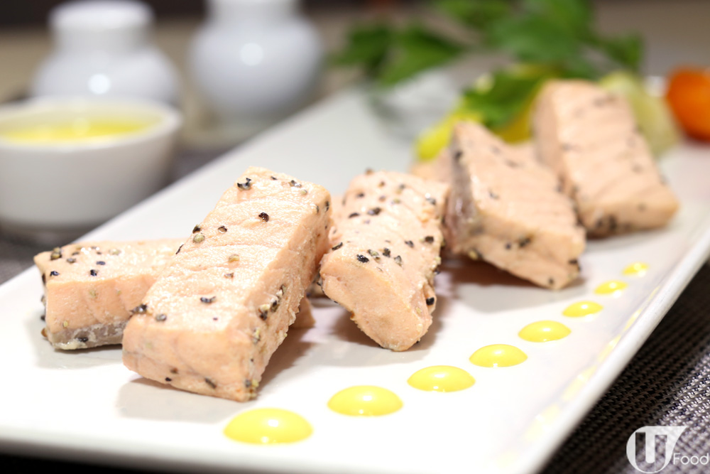 也推介兩款花心機炮製的前菜,三文魚以 60 度慢煮 3 個鐘,生熟度啱啱好,唔嚡口;自製法國鵝肝醬前後花上超過一日製成,質地幼滑。
