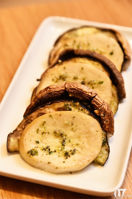 雞髀菇及大啡菇簡單抹上香草牛油後烤焗,中間嘅澳洲茄子盡吸菌香,是精華所在。
