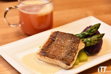 比目魚煎香後,淋上柚子忌廉汁;醬汁帶柚子的酸味,旁邊嘅紫薯蓉甜度十足。