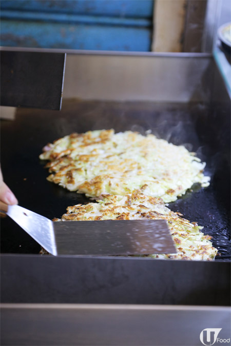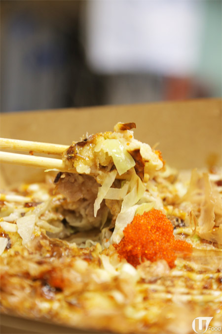 大阪燒有肥牛、海鮮及煙肉3款餡料選擇。大阪燒唔係用現成整好嘅來貨,小店以大量椰菜絲加粉漿製成,有柯打再放在鐵板上煎焗。