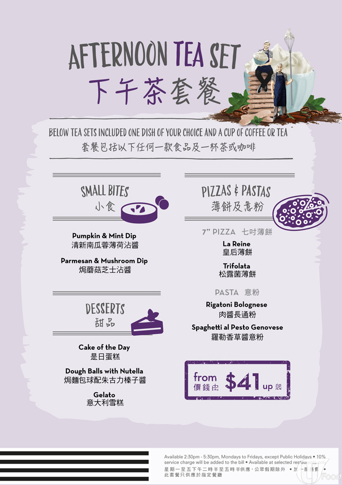 PizzaExpress 新出的下午茶有 9 款選擇,包括清新南瓜蓉薄荷沾醬、焗蘑菇芝士沾醬、皇后薄餅、松露菌薄餅、肉醬長通粉、羅勒香草醬意粉、焗麵包球配朱古力榛子醬、意大利雪糕及是日蛋糕;有小食有甜品有飽肚,薄餅仲係 7 吋大!揀選一款心水食物,客人仲可 order 茶或咖啡,最平 $41 就食到,都算抵。