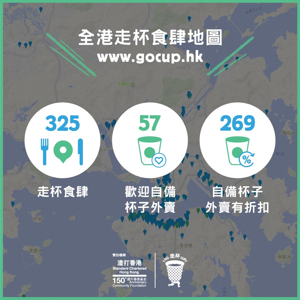 為咗鼓勵你同我都自備杯子,「走杯 GO CUP」( https://www.facebook.com/GoCupHK/?hc_ref=PAGES_TIMELINE) 同全港 325 間走杯食肆合作,可以讓客人自備杯子外賣,仲有 269 間提供折扣優惠!