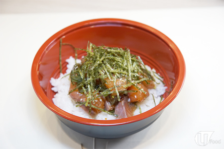 層層疊魚生飯,同樣即叫即做,有混和醬汁的三文魚刺身粒粒、中華沙律及飛魚子。