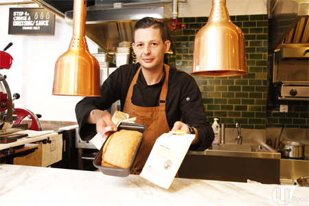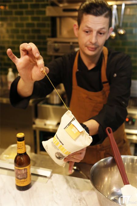 今次,請來跑馬地新店總廚 Chef Eric 親身示範其中一款「Italian Cheese」,材料只有呢包麵包粉 + 一枝 330 ml 啤酒,把兩者拌勻,捏成麵包形,倒到預先塗上牛油的焗盤上,以 190 度,焗 45 分鐘,即有香噴噴麵包出爐!Eric 說:「因為加上啤酒,麥味會好香濃,如果加黑啤,麥味會更突出。如果唔鍾意啤酒的話,亦可以改用梳打水。」
