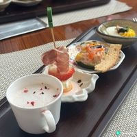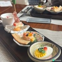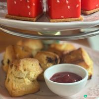 下午茶前菜包括水煮蛋配士多啤梨及魚子醬挪威煙三文魚他他士多啤梨火腿串配布里芝士士多啤梨乳酪蕃茄泡沫濃湯。每樣都加入了士多啤梨元素。