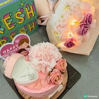 以夢幻粉嫩色調搭配三色忌廉花蕾與新鮮士多啤梨,造型高貴優雅。蛋糕頂部設有永生花首飾盒,可作收藏之用。
